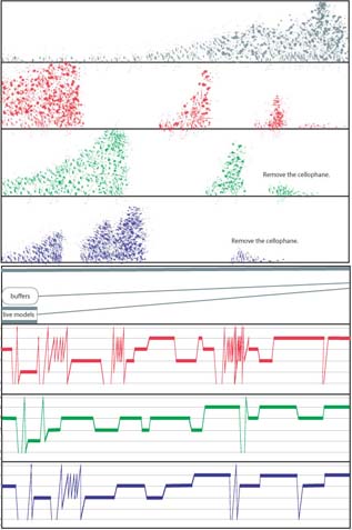 three cellophane/tube players, tube physical models and real-time