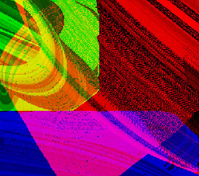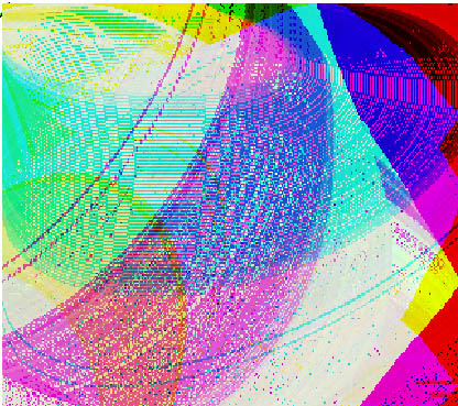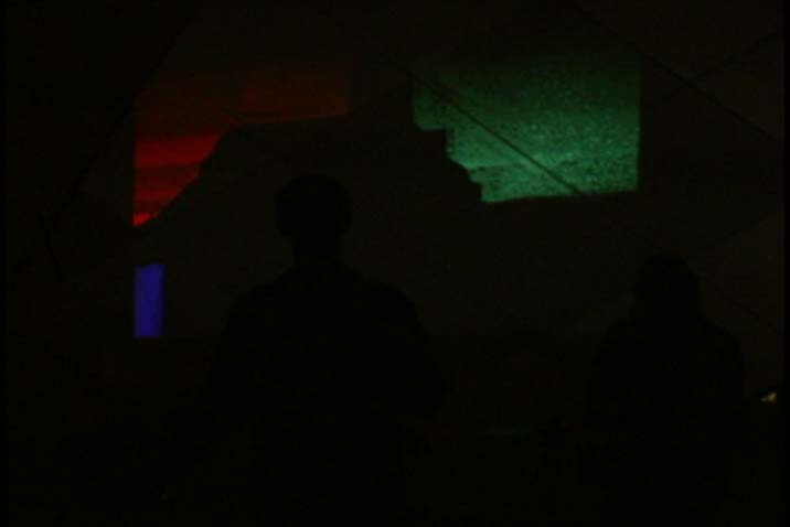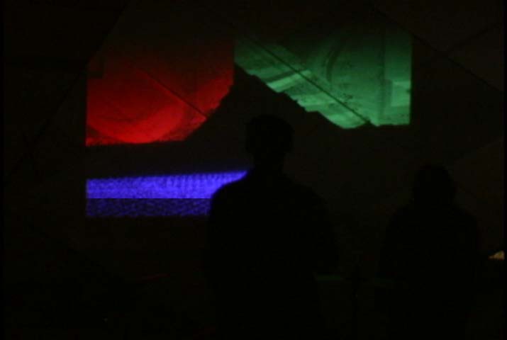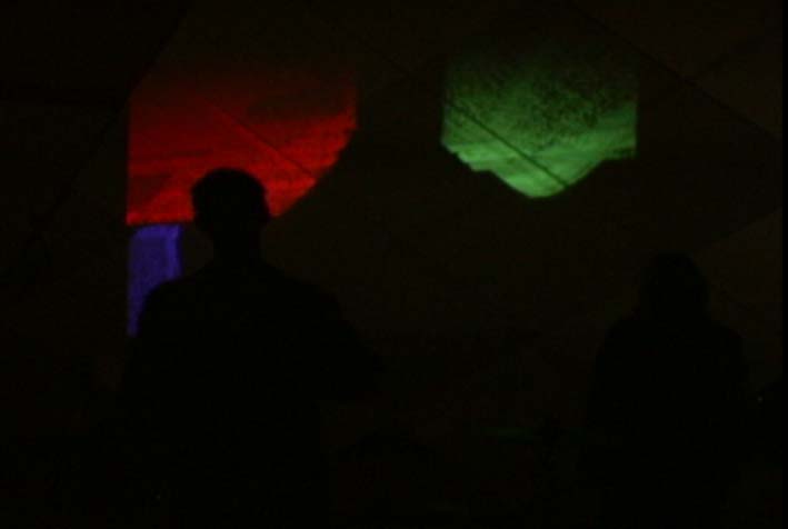 The players alternate between their performance locations as well as their instruments. They keep mapping the graphics according their original instructions (e.g. a player mapping red continues reading this color as indicated in his/her score whether vocalizing, playing inside the piano, or bowing the bass guitar); yet depending on the screen position of their corresponding color they change the location and instrument.