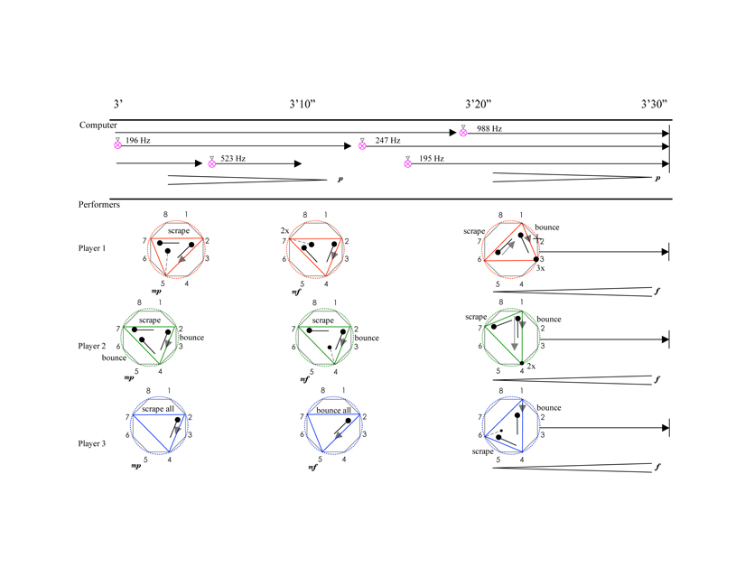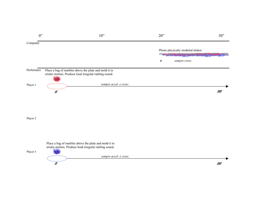 Perry Cook’s PhiSM stochastic physical models and bowed percussion bar model by Georg Essl and Perry Cook ported to MAX/MSP as PerRColate library were utilized in the computer part of Revelations. Additionally, Stefania Serafin’s bowed violin model and gestural models of synthesized bouncing and rolling designed by the author were employed. The computer component consists of pre-processed (tape) and real-time materials. MAX/MSP patches introduce the synthetic models in real-time. Sampled materials of percussive surfaces such as timpani, tam-tam, glockenspiel, tenor drum, and glass pane scraped with a rubber ball are mixed with the models in the pre-recorded part.