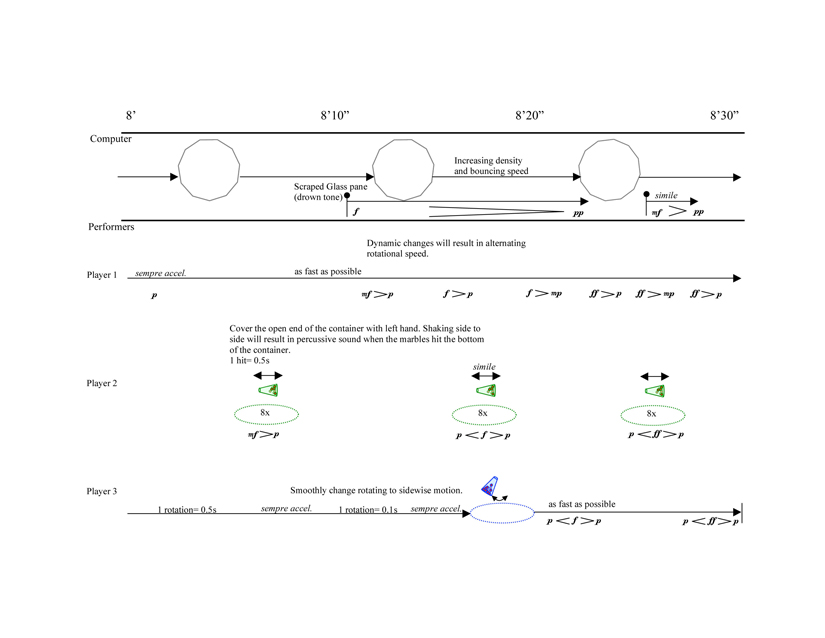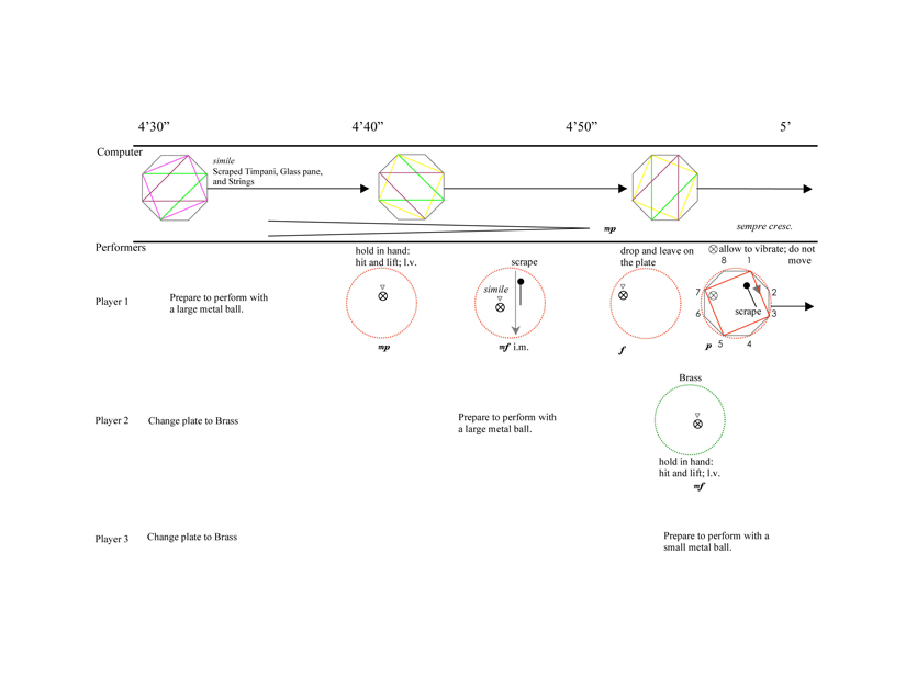 Revelations is scored for elastic rubber balls, Bocci (Patang) metal balls, glass marbles, resonant plates made of Plexiglas, plastic (glossy and matte), aluminum, and brass, and computer. The three performers use circular toys to excite the plates in a variety of performance modes such as bouncing, rolling, and scraping. At the end, the players additionally perform with a shaker filled with glass marbles.