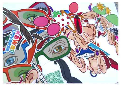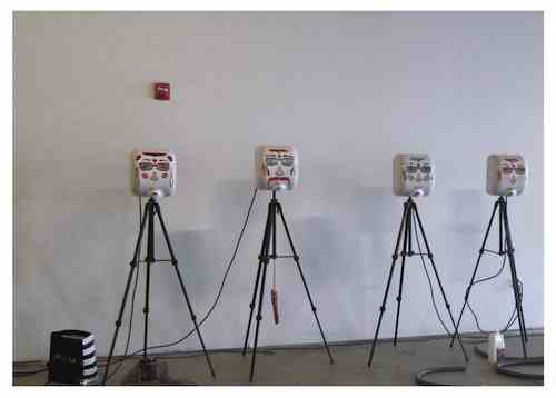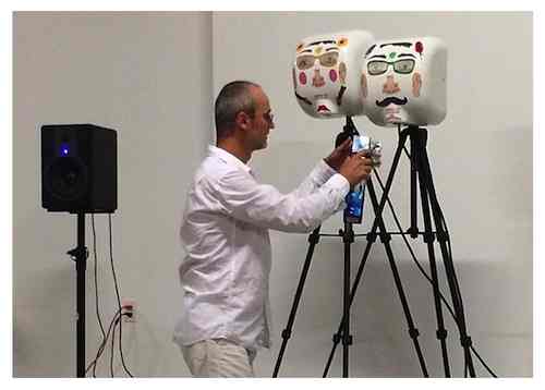 Juraj Kojs: The Visitor (2014) for six Hand Dryers and interactive sound The Visitor is a 20-minute site-specific performance in which the main character (Juraj Kojs) visits three couples of Xlerator hand dryers, making them excite various everyday objects. The performance opens with Kojs singing a series of long-sustained poignant calls in Slovakian. Strolling through the space filled with the standing audience, his voice is electronically processed, creating a haunting chordal tapestries. Kojs ceremonially visits each pair of the hand-dryer characters, offering each of them a gift and making their turbulent air flow excite the gifts to produce unique sonic expressions. The grandfather receives a bottle of tequila, the grandmother a book, the mother a can with beans, father a pan flute and the two siblings a pair of painted balloons. The sounds produced by these objects are continuously processed by and recored into the computer, creating sonic memories-- sonic footsteps of the visited locations. The piece concludes when Kojs finds a performance location to position himself in a statuesque hand-dryer-like pose, while controlling the recorded sounds with the wireless sensor technologies mounted on his wrists. The performance is both funny and emotional. In it, Kojs contemplates the metonymic qualities of everyday objects, explores the unexpected sonic terrains and confronts the longing for formation of unique human-machine relationships. Face stixcker design by Kawai Universe. Sound Tech: Mariano Venini. Premiere: March 15, 2014 at the Moore Building in Miami, FL.