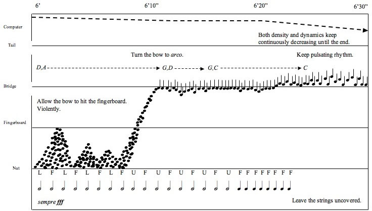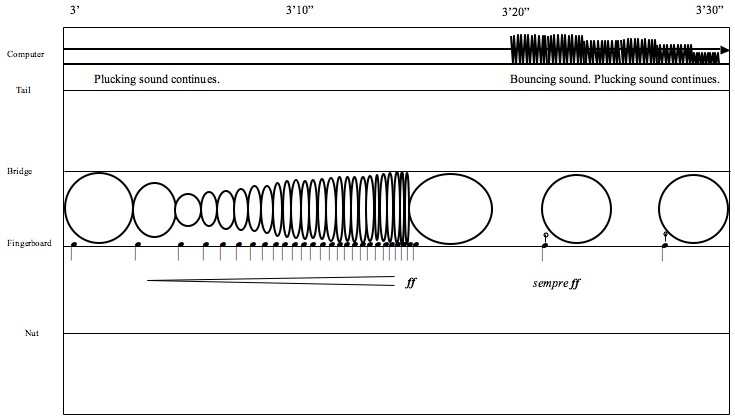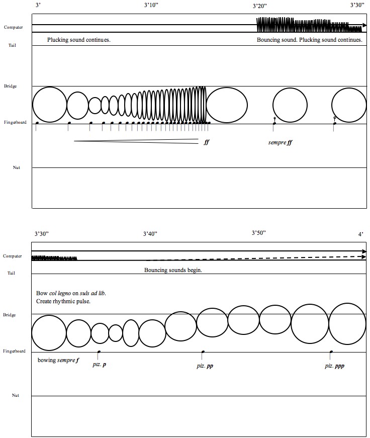 To Where He Waited belongs to a series of pieces inspired by poetry of St. John of Cross. These compositions explore instrumental sonorities that lie on the border of hearing. In To Where He Waited, cello predominantly produces colored noise. The concealed pitch becomes heard as the color of timbre. The electronic part uses the MAX/MSP implementation of the two-dimensional waveguide mesh physical model designed by Julius Smith and Gary Scavone and ported to MAX/MSP by Dan Trueman. The model represents a membrane—a sonic barrier, which is excited by the cello signal. The cello sound is heard only when it passes through this virtual wall in MAX/MSP. A number of models were tuned to the pitches derived from the letters of the poem. The electronic part combines the real-time and pre-recorded sonorities of the resonating models. To hear some audio examples, click here: Example 1 (J. Kojs, cello, MP3, 940Kb), Example 2 (J. Kojs, cello, MP3, 780Kb). Click to view the score exmples. |