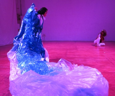 "Sloshing and banging sounds are supplanted by squeaks, deep breathing, windy wails and a haunting dark melody line, reminiscent of Twin Peaks. Sounds emanate from various sources, including the costume's wig, as the tethered performers advance toward the bare dance floor. " George Fishman